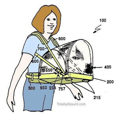 Not technically a product, but a patent that someone actually devoted a period of their rapidly diminishing time here on Earth writing up and submitting to the patent office with the earnest belief that people might actually buy it with real money. The device is designed to carry your dog on long walks so you don’t look like a complete tool by carrying it in your purse.