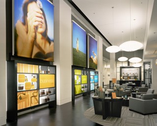 Customers, in effect, hang while they bank. The idea is to walk in, gaze at interactive digital signage, sip free brew, lounge in the comfortable seating area—and stick around long enough to do some banking on the side.