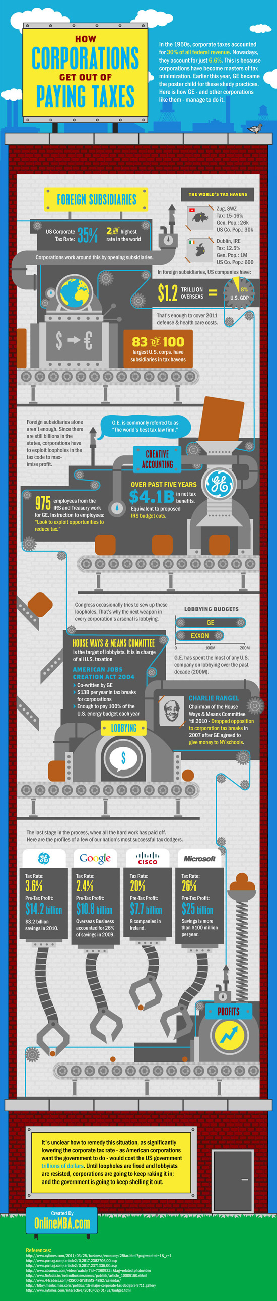 There’s been a lot of media-driven furor this year around the issue of humongous corporations weaseling their way out of paying taxes, with GE taking a brunt of the public assault. While with each passing month we hear of some new offender, one wonders how it is that these companies are actually able to do it. This infographic from Online MBA breaks down the factory-line process by which corporations ingeniously – and, most say, unethically – minimize their taxes.
