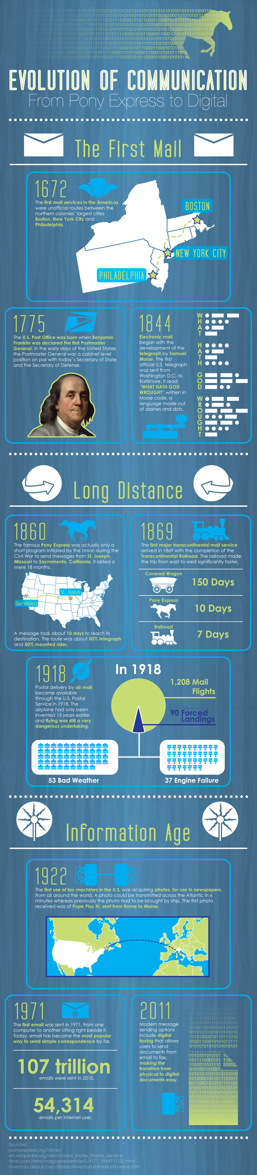 In 1672, the first mail services in Americas were unofficial routes between the northern colonies’ largest cities Boston, New York City, and Philadelphia. As the colonies grew they found their need for better communication growing. This need would spawn the evolution of communication in United States of America. Starting in 1844 with the invention and use of the telegraph by Samuel Morse, to the first use of a fax machine in 1922, and finally the dawn of the of the digital age in 1971 with the first email. Since then America’s need for constant communication has moved into online faxing, video sharing, live web conferencing and more. See what led us down this path and what the future holds for communication in America.