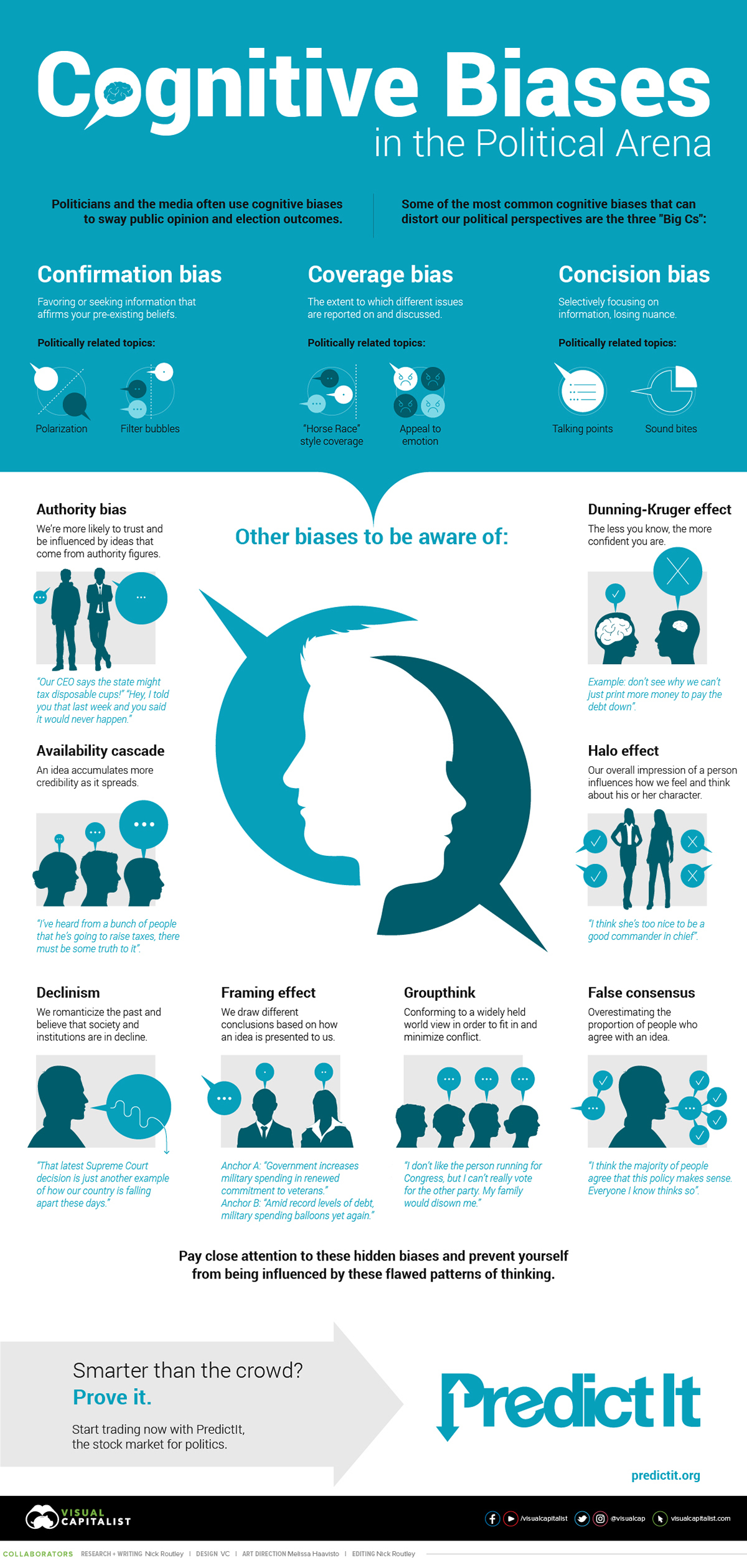 By being aware of these types of cognitive bias you can avoid being played by the media and politicians. Staying true to yourself and your own beliefs is more difficult that it sounds when big media and politicians are constantly using these common forms of cognitive bias against you.