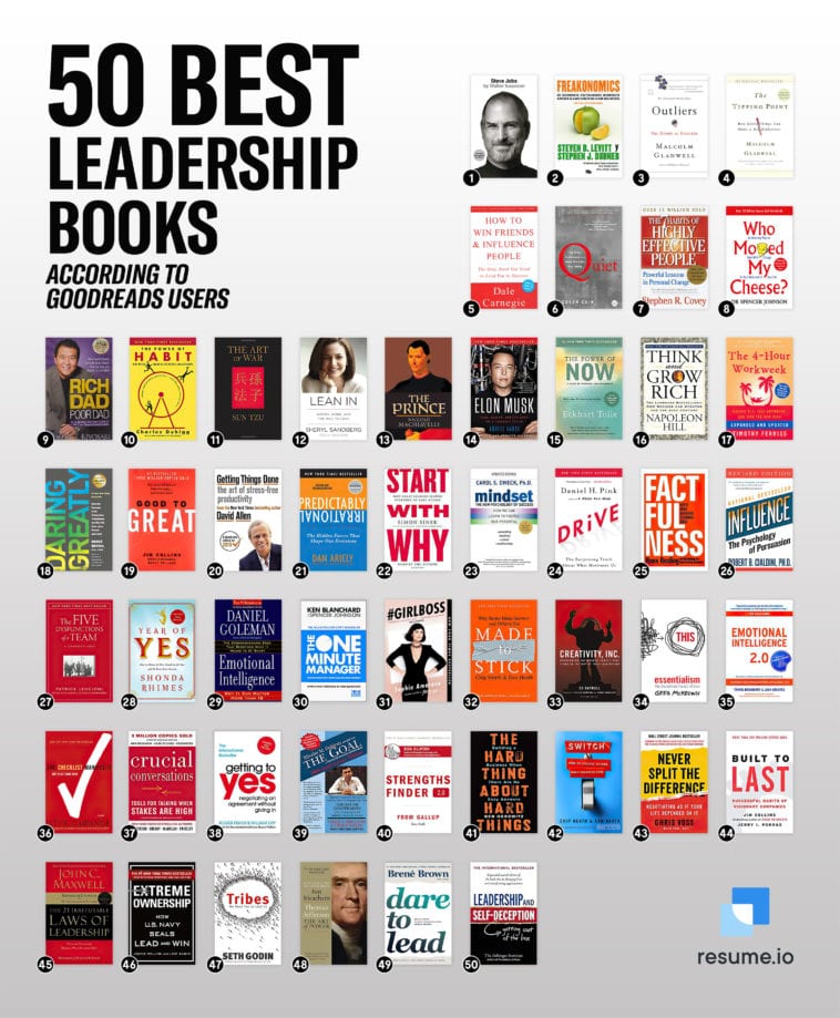 The resume experts at Resume.io used Goodreads user data to identify the top 50 best reviewed and most recommended leadership books of all time. You can see the full ranking here:
