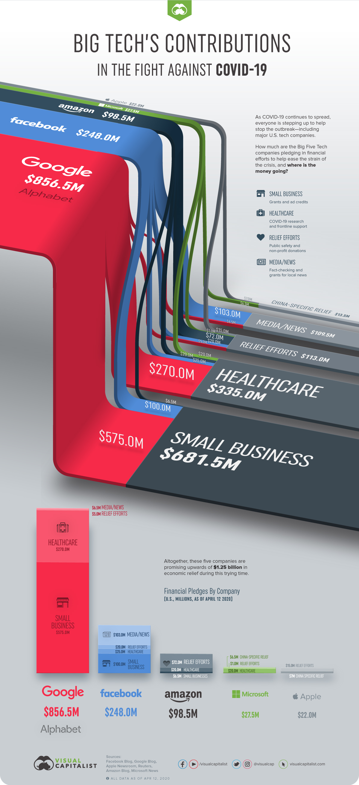 Google (Alphabet), Facebook, Amazon, Microsoft, and Apple have all contributed millions to COVID-19 relief efforts.