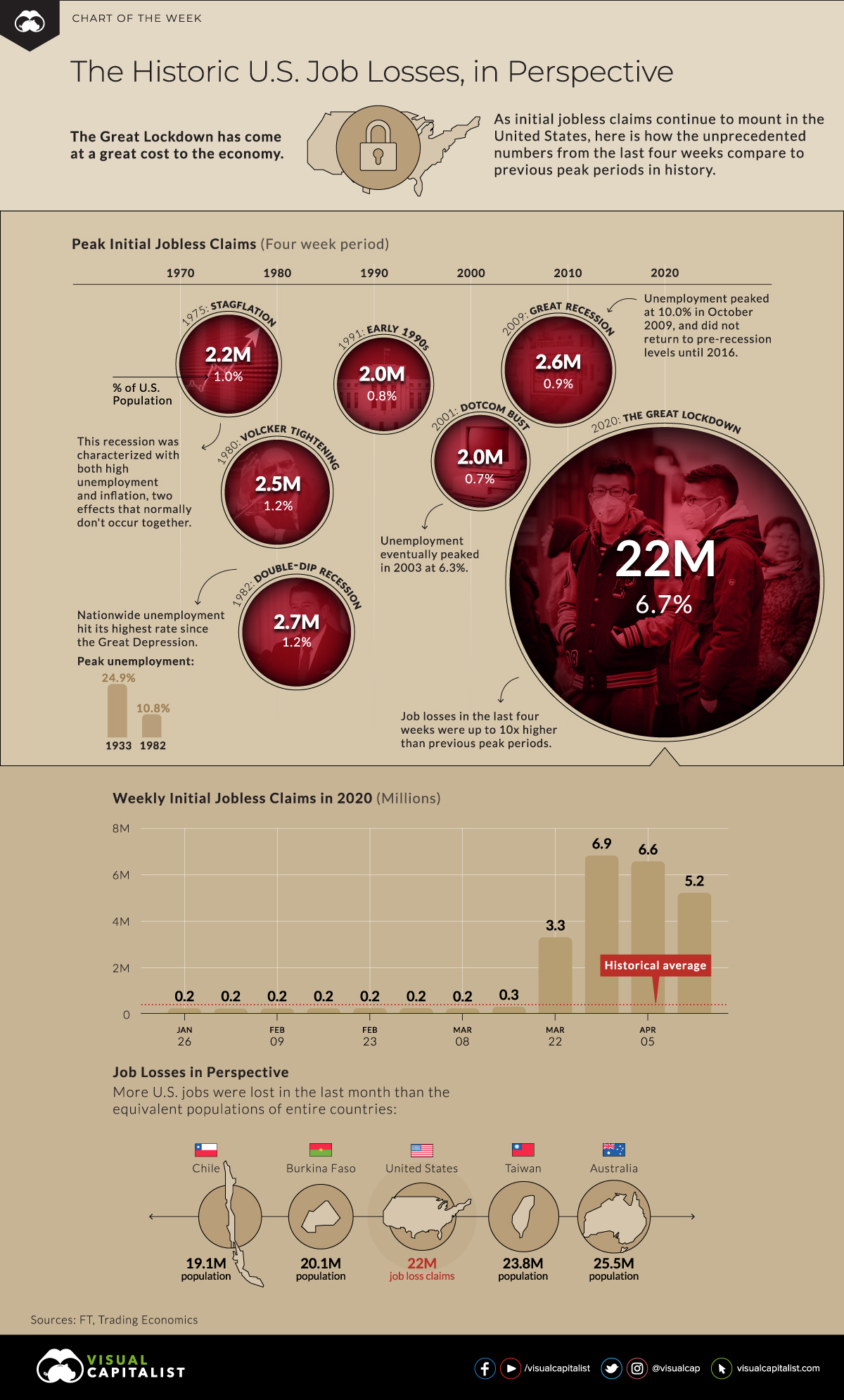 This graphic by Visual Capitalist illustrates the sheer magnitude of the number of new initial unemployment claims as compared to previous periods in history with alarmingly high unemployment.