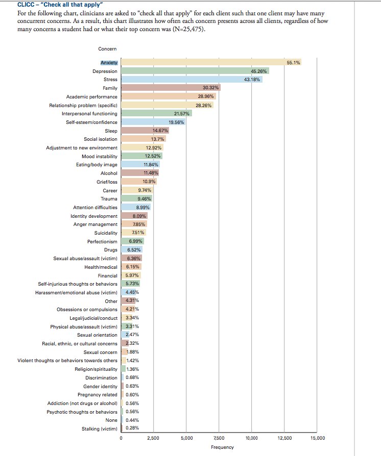 In 2010, a national study showed that nearly half of college students seeking counseling had serious mental illness. Those students outnumbered a 2000 study by 100%.